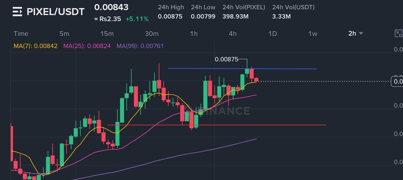 PIXEL اس وقت $0.0843 کے آس پاس ٹریڈ ہو رہا ہے۔ چارٹ کو دیکھ کر صاف لگ رہا ہے کہ مارکیٹ ایک مضبوط "Upward Trend" میں ہے، لیکن ابھی ایک اہم موڑ پر کھڑی ہے۔