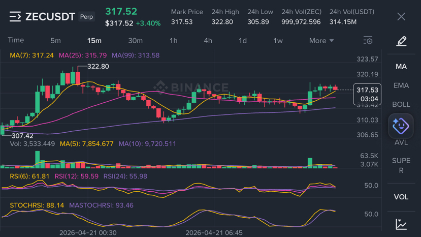 $ZEC Current Price: $317.52 | 24h High: $322.80 | 24h Low: $305.89