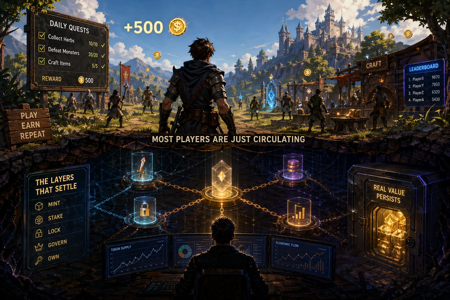 There's a difference, and it took me a while to feel it clearly. Circulation means your activity is real, your time is real, the numbers move and respond to what you do, but nothing actually accumulates in a way that persists. You complete a quest, tokens arrive, tokens leave, the loop resets. It's motion without settlement. And for a long time that feels like progress because the feedback is immediate and the system never stops responding to you.