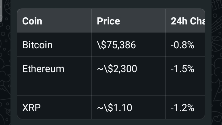 - *BTC ∼$75,386* par hai, kal 0.8% gira