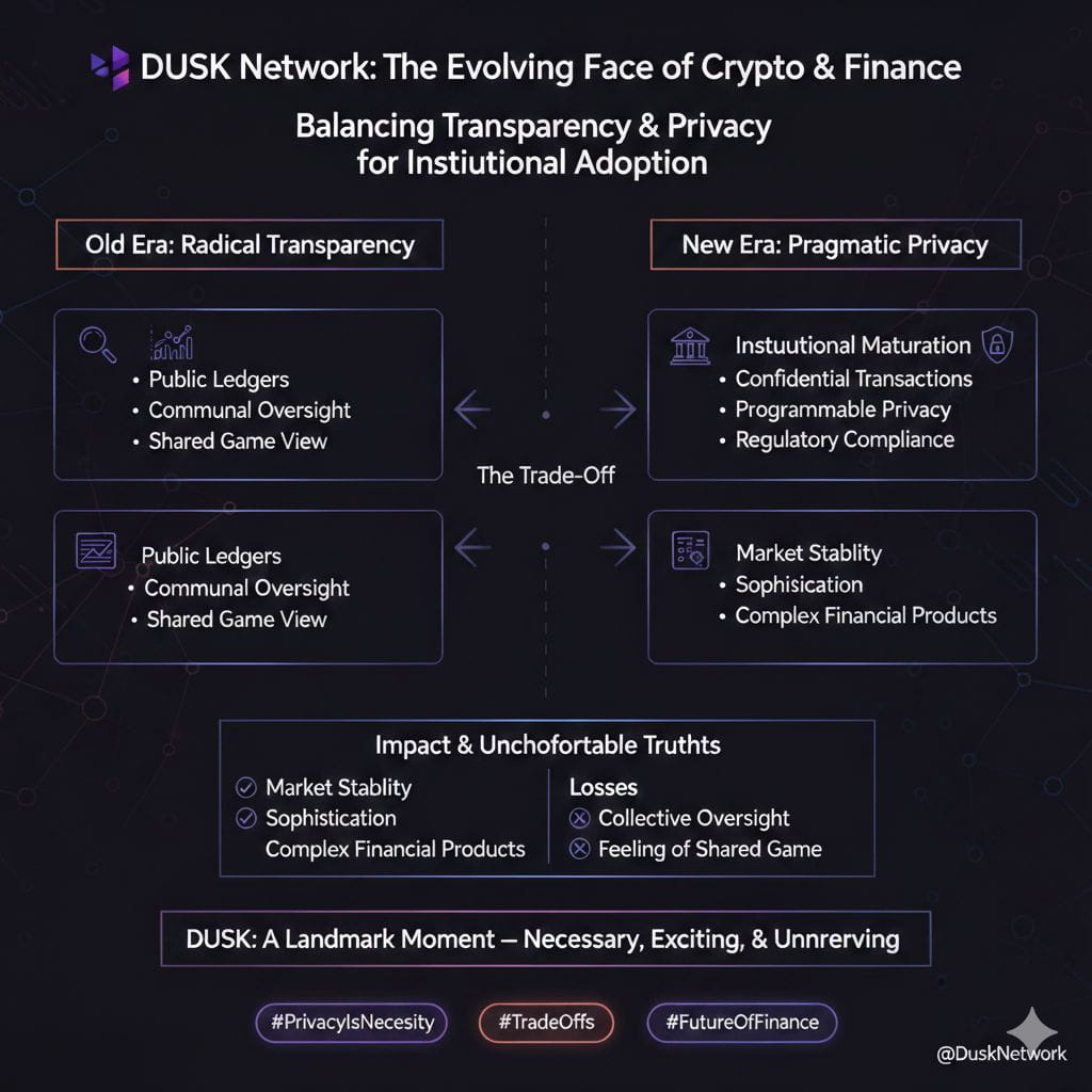 Maybe this is progress. Maybe it is the price we pay for adoption stability and growth. Or maybe it is a trade off we are only beginning to understand. Whatever the case DUSK reminds us that blockchain is no longer purely about radical transparency it is about balance privacy and the complex reality of bringing decentralized finance into the regulated institutional world. And for better or worse that world will look very different from the one we first fell in love with.