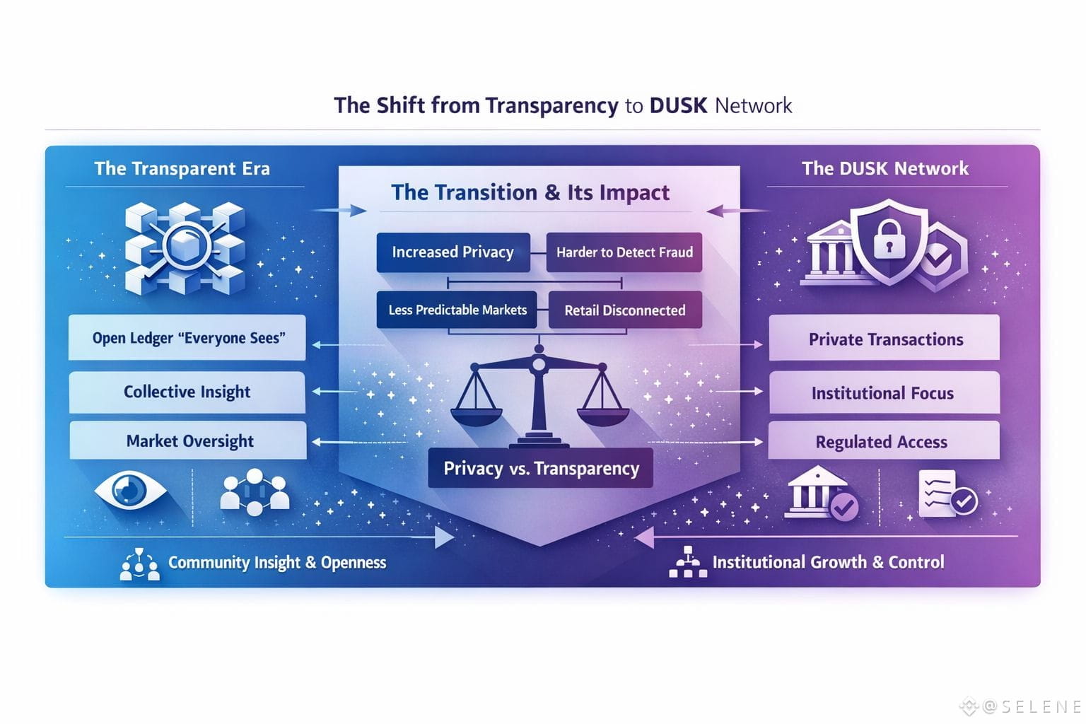 On the other hand there’s a loss here that’s hard to quantify. We are losing something strange intangible but real the collective visibility that kept the market in some ways honest. When everyone could see everything it was difficult for even the largest players to operate completely in secret. The market had a communal eye flawed and incomplete but real that imposed a form of accountability. With DUSK’s privacy that communal lens disappears. We are entering a world where participants see only fragments of reality the full picture is reserved for a privileged few.