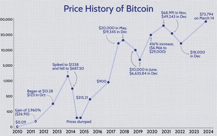 The outflows from certain funds slowed going into March, settling the market somewhat. The marketwide rebalancing was likely because there were suddenly more options for investors to choose from.Bitcoin's price climbed quickly after the fund approvals—in late February and early March, it once again breached $60,000, setting a high of $69,210 on March 6 and another of $70,184 on March 8. On March 14, Bitcoin continued setting records, reaching $75,830 by mid-day on EXMO, a cryptocurrency exchange in Poland.