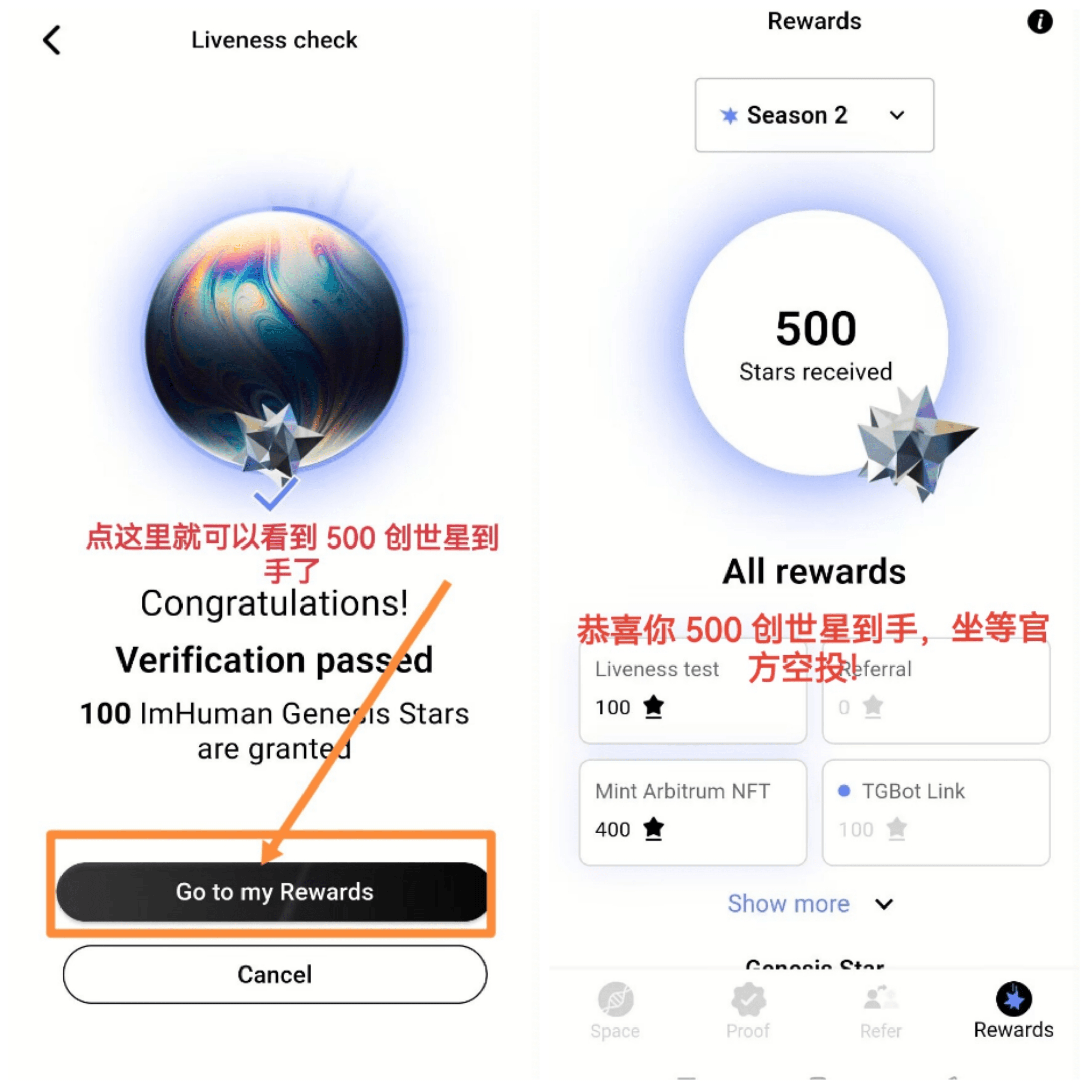 6.完成,拿到 500 创世星,坐等 TGE 和空投