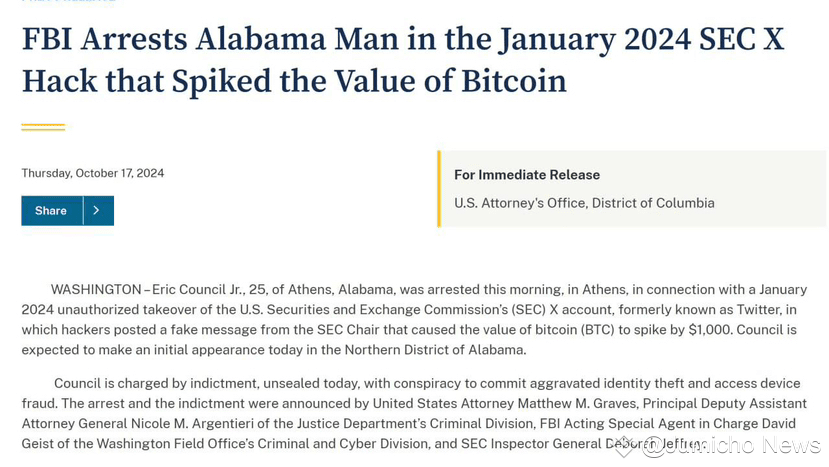 Эрик Каунсил-младший из Афин (штат Алабама), был арестован в связи с несанкционированным захватом аккаунта SEC в X (бывший Twitter) в январе 2024 года. Хакер опубликовали фальшивое сообщение от имени председателя SEC, что вызвало рост стоимости биткоина на $1000.