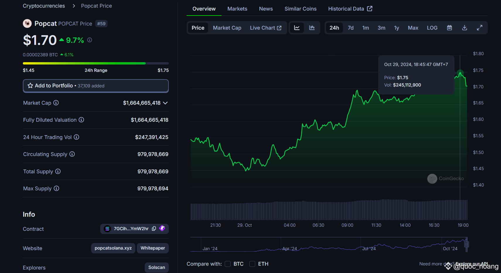 Popcat (POPCAT), memecoin phổ biến trên Solana, vừa lập kỷ lục mới ở mức đỉnh $1,75, với mức tăng hơn 14% trong 48 giờ qua, dẫn đầu đợt tăng giá mạnh mẽ của các memecoin dựa trên Solana.