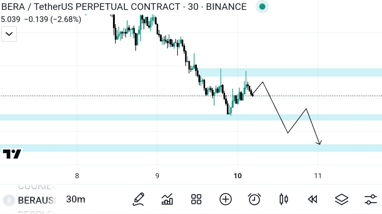 $BERA is in Downtrend, if you look bera as a price action, it is continuously forming lower low and my rule is that in Downtrend, rejection candle should be formed at resistance with low volume and there should not be wick in the candle, as you can see, same setup is forming in Bera also at 5.4$ level... Let's short🎯