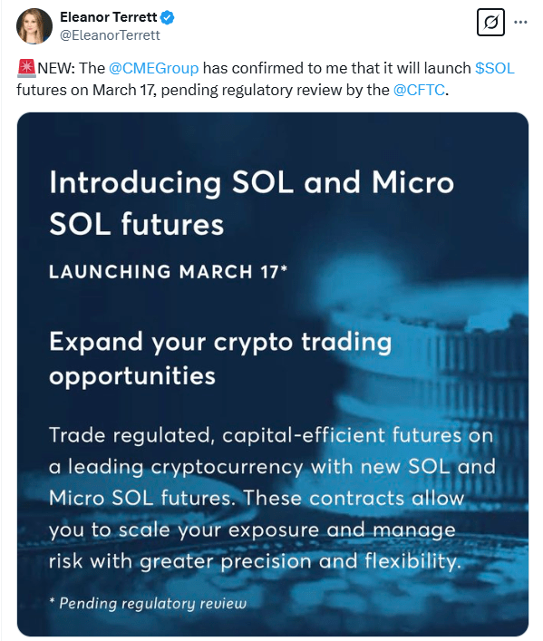 Solana futures are launching on the Chicago Mercantile Exchange (CME). Why does this matter? Because futures ETFs often precede spot crypto ETF launches. This could mean the SEC is warming up to making $SOL tradeable in traditional finance, opening the door to a whole new wave of investors.