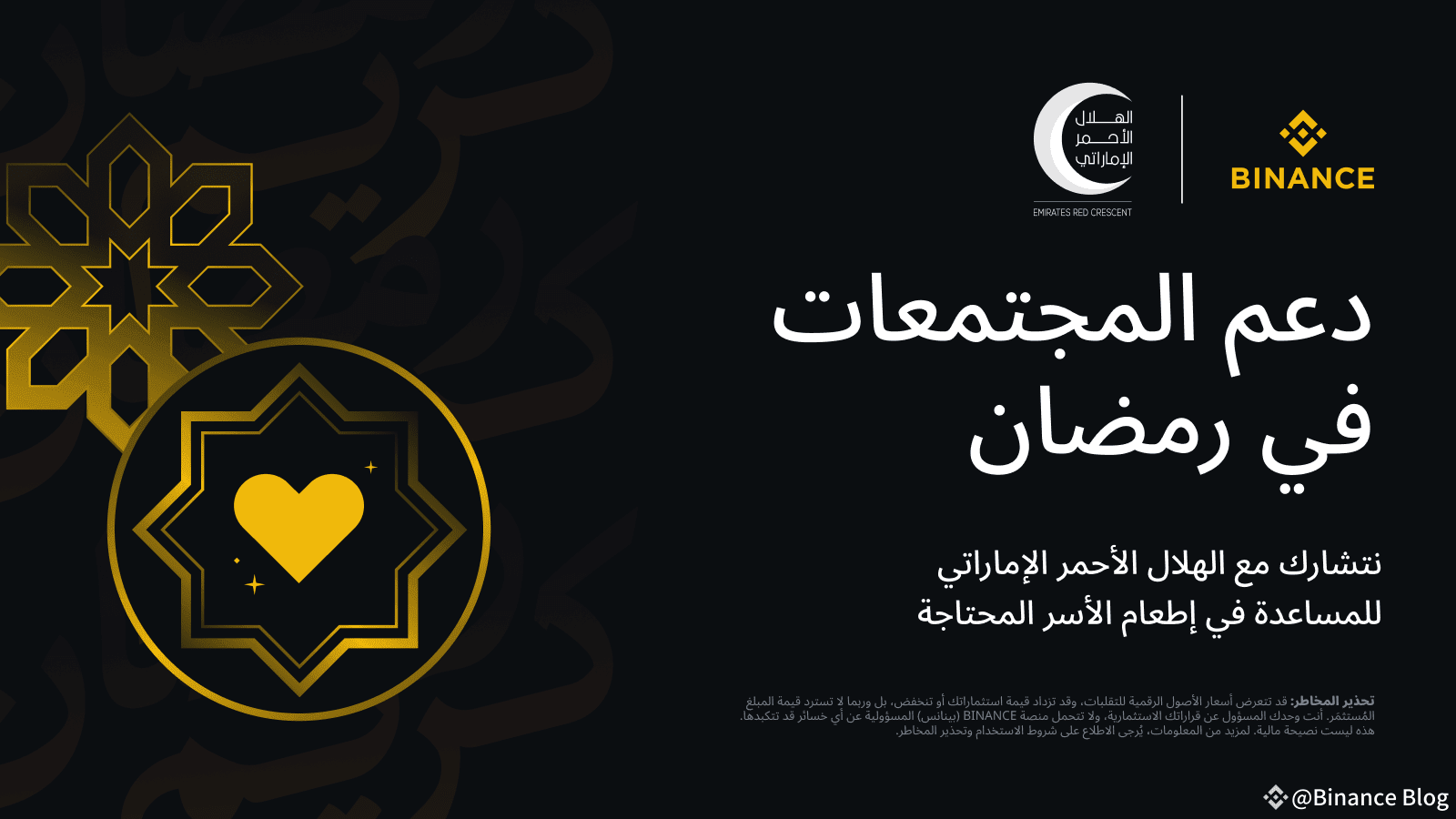 في رمضان من هذا العام، تفخر Binance بالوقوف مع المجتمع بروح التكاتف. ومن خلال مبادرة صناديق الطعام والتبرعات من Binance، نأمل أن ندعم العائلات المحتاجة في المناطق المختلفة، لضمان ألا يُترك أحد دون مساعدة في هذا الشهر المبارك. ومن خلال تحدي أعمال الخير، نعمل على تمكين مجتمعنا العالمي من أخذ زمام المبادرة ومشاركة الأفكار وإحداث تغيير ملموس في حياة الآخرين.