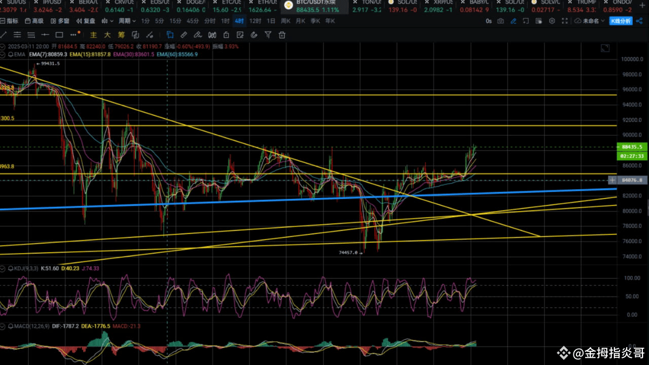 总体来看,BTC目前处于一个反弹阶段,但整体趋势依然偏弱。短期内需要密切关注价格能否突破EMA的压制以及MACD和KDJ指标的变化。如果反弹动能增强,并且技术指标给出买入信号,可能会迎来一波上涨行情。否则,价格可能会继续在低位震荡,甚至再次下探支撑位。
