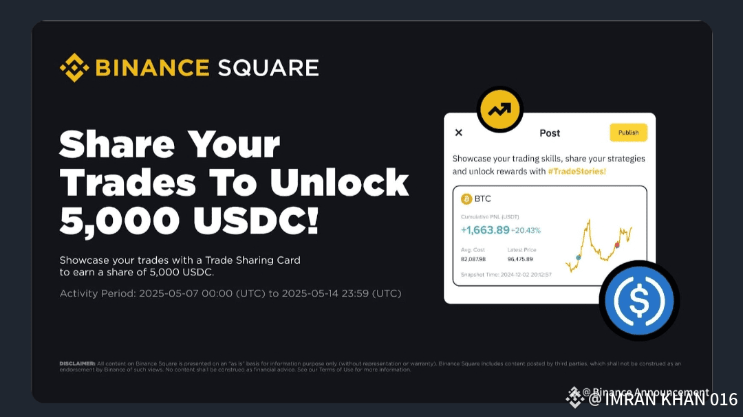 Binance Square is pleased to introduce Trade Stories, a Trade Sharing Challenge where users who post about their trades using the Trade Sharing Card feature can earn rewards. Eligible participants can get a chance to unlock a share of 5,000 USDC in token voucher rewards!