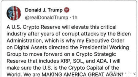 “It’s time for a U.S. National Cryptocurrency Reserve. Strategic digital assets like XRP, Solana ($SOL), and Cardano (ADA) should lead the way.”