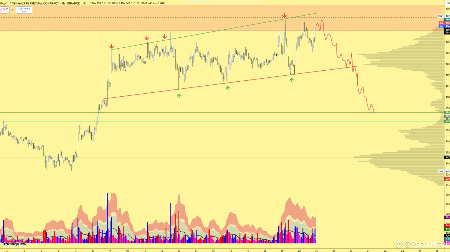 The reason for this potential pullback is visible on the chart: Bitcoin is trading within a wedge pattern, and a breakdown below the lower trend line could trigger a sharp downward movement. At present, $BTC is sitting at a weekly supply zone—a historically strong resistance level that is not easy to break through.
