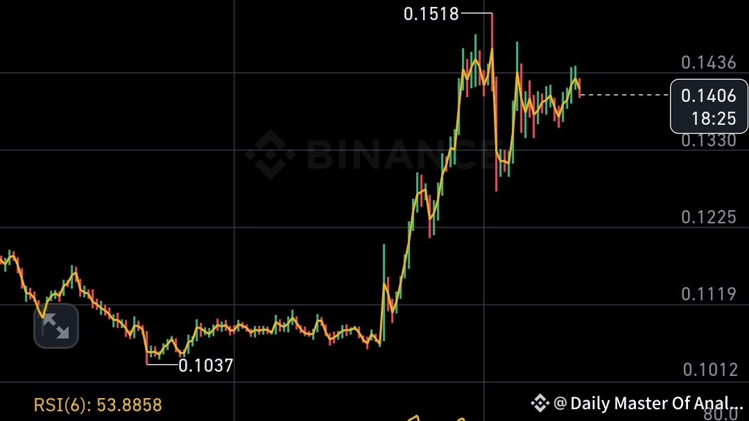 RSI at ~54 indicates moderate strength, MACD is near a bullish crossover, and volume is staying healthy after the recent surge. A clean breakout above $0.1518 could lead to the next leg up! Keep an eye on that resistance level. #SXTcoin