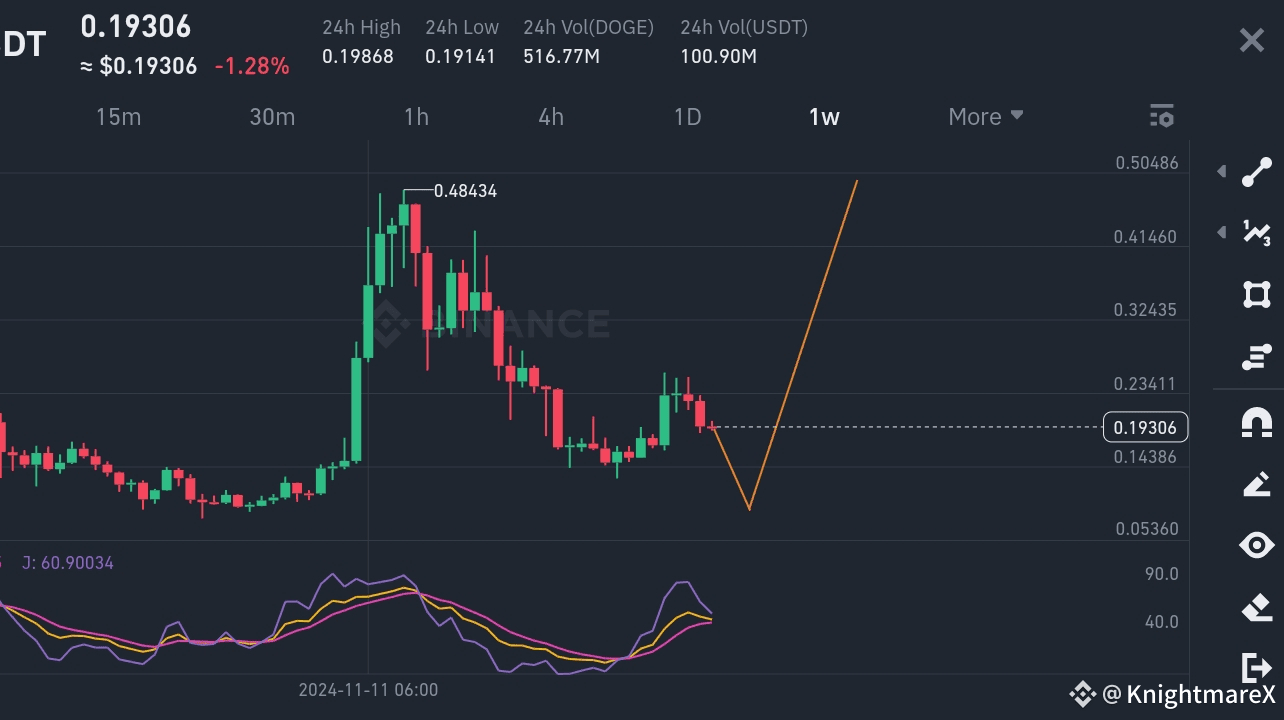 The DOGE/USDT chart shows a daily timeframe with a current price of $0.19306, down 1.28%.