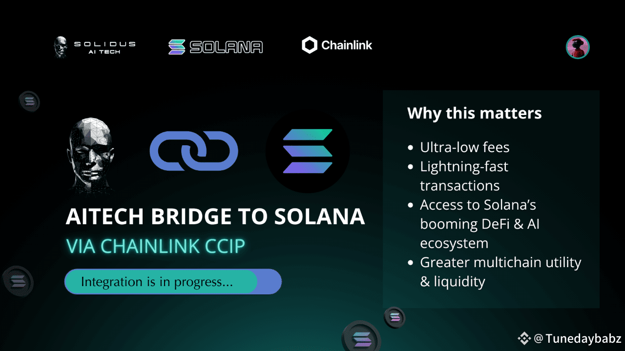 #Solidus AI Tech is making a major leap forward with its upcoming integration into the Solana ecosystem — powered by Chainlink CCIP. This isn’t just about faster and cheaper transactions. It’s a bold move in Solidus’ cross-chain roadmap designed to make $AITECH more accessible, scalable, and valuable across the Web3 landscape.