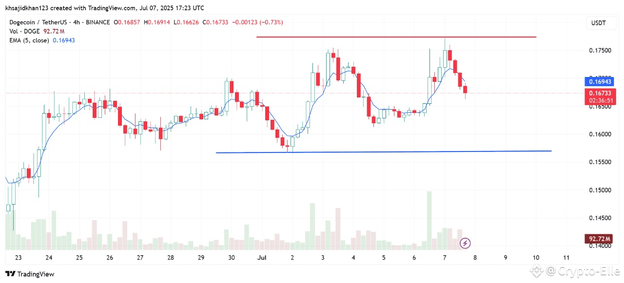 The 4-hour DOGE/USDT chart shows a clear range between roughly **\$0.158** (blue support line) and **\$0.175** (red resistance line). Price repeatedly bounced off \$0.158 in late June (a double-bottom formation) before surging into resistance in early July. Notably, DOGE jumped \~5% from \~\$0.163 to \$0.171 on July 6–7, backed by heavy volume, but failed to hold above \$0.174 and has since pulled back. This action fixed short-term support at \$0.158 and resistance at \$0.175. In technical terms, the chart shows a classic double-bottom reversal off \$0.158. Traders will watch whether this base holds, as another dip to support could set up a bull run, whereas a close back below \$0.158 might open the door to deeper declines.