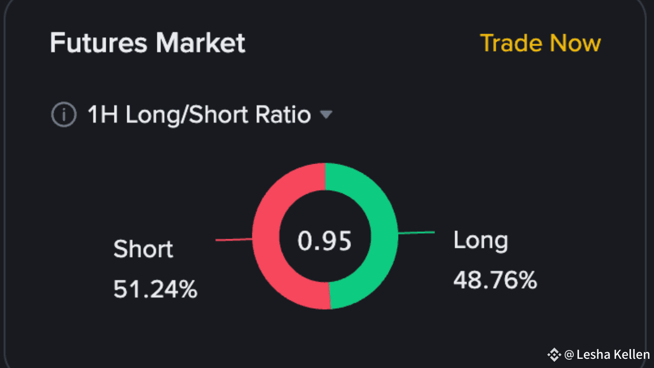 In the image above, you’re seeing the 1-Hour Long/Short Ratio from the Futures Market. It means that 51.24% of traders are betting on prices going down (Short), while 48.76% expect prices to rise (Long). The ratio is 0.95, which means short positions slightly dominate.