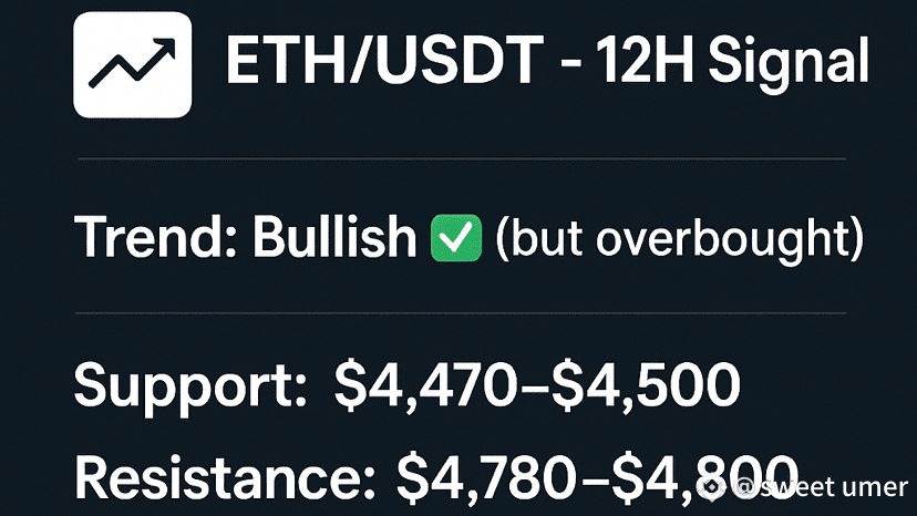 ETH pulled back from the recent $4,788 peak to $4,603 — a mild correction within a strong uptrend.