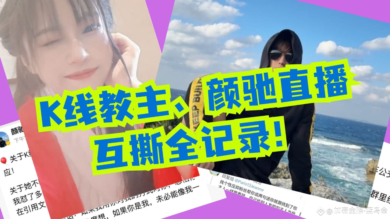 在K线教主与币毒互喷的当口,颜驰在广场发了几条意味深长的帖子,包括:影射某些"币圈红姐"、暗示某些人有"人格问题"、贬低广场博主的价值。最让K线教主愤怒的是,颜驰的言论波及到了她的好友婉宁。这成为了压垮骆驼的最后一根稻草。颜驰在直播中为自己辩护:"我说'广场博主不值钱',这有什么问题?她上一秒说'我来广场是谈恋爱的,不是为了流量',下一秒又让人用她的邀请链接注册。这不是装吗?"