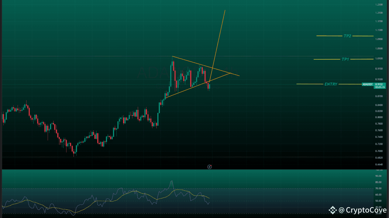 ADA is forming a symmetrical triangle. Price is holding above the entry zone near 0.91 and is preparing for a breakout.