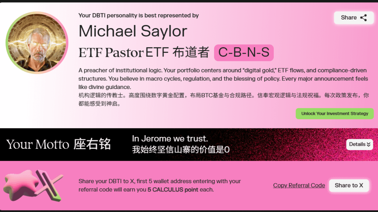 大仙发现 x.com/CalculusFinance 推出了链上首个交易人格测评系统 DBTI (Decentralized Behavioral Trading Index)超级有意思,如图所示: