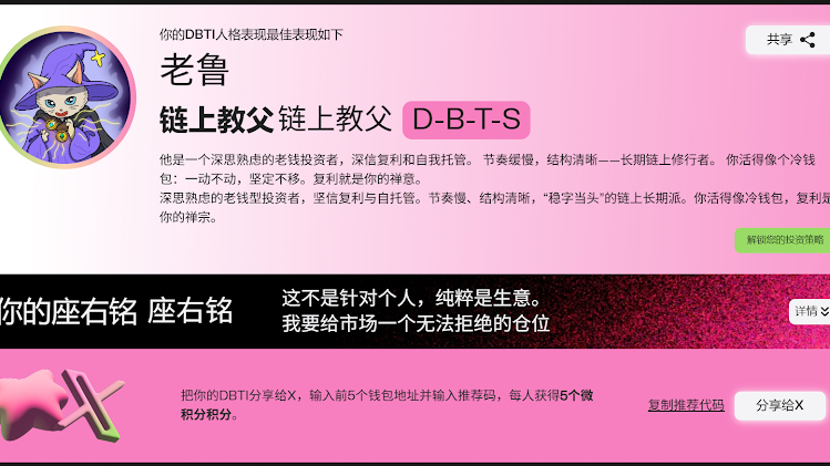 我已经使用自己的官方邀请码完成了 DBTI 测试,并参与组队,如果你也想一起参与这次心理学向的交易实验,大家可以一起冲这 0.5% 的 $CALCULUS 奖池。基于 DBTI 的人格特征,我也大胆猜测一句:Based on #DBTI traits, I guess @CZ DBTI = ETF布道者👀。
