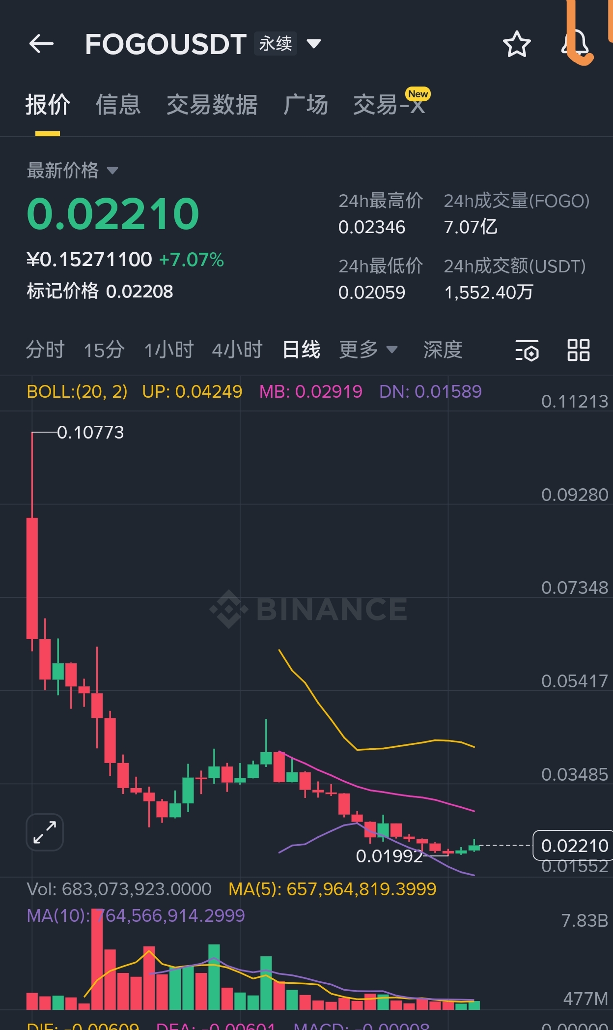 上线初期$FOGO经历了剧烈波动,目前价格在0.021美元附近横盘筑底。技术面上MACD已形成金叉信号,显示多头动能正在积聚。