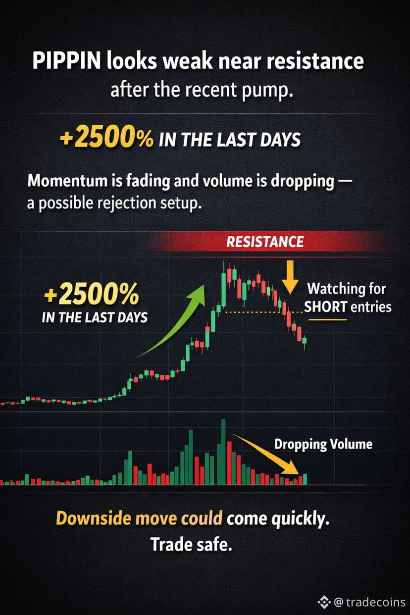 PIPPIN pumped hard, but momentum is slowing near resistance. Volume is declining — watching for a possible short-term pullback.”