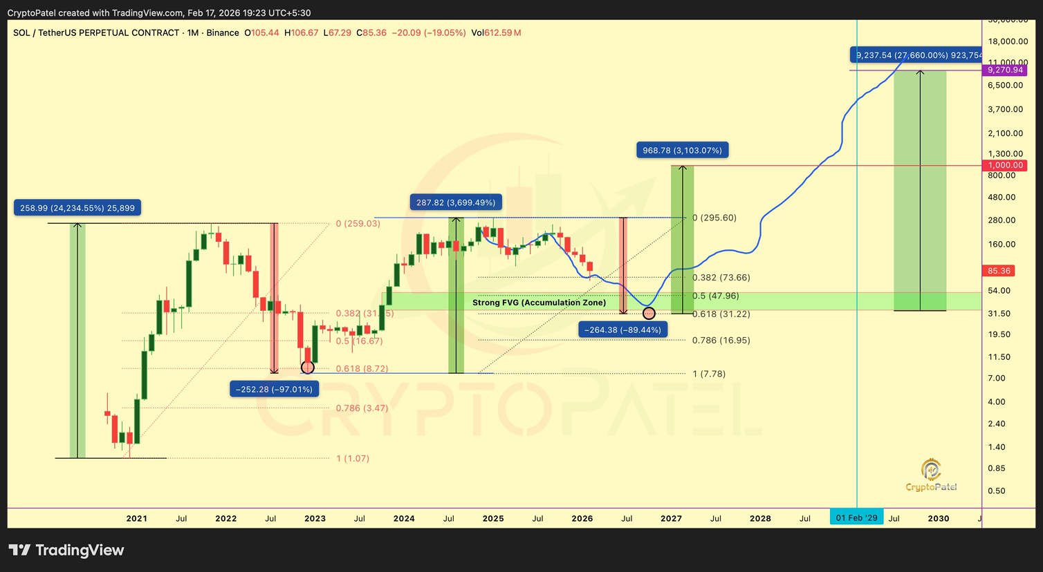 Solana is currently trading around $85 and testing the 0.382 FIB level. This is a critical zone. If price holds here, we could see some recovery. But if this level breaks down, I expect another leg down to the $50-$30 range which sits at the 0.5 and 0.618 FIB levels.