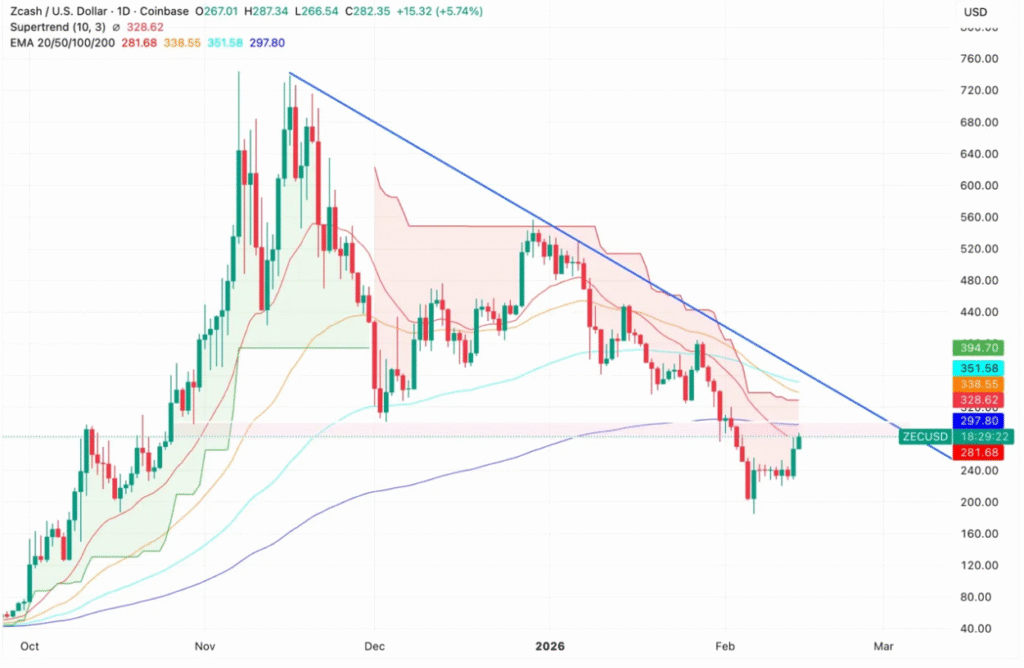 The next few days will be crucial for Zcash, as the cryptocurrency attempts to hold above critical support levels. A close above the 200-day EMA at $297.80 would signal a potential trend reversal, opening the door for further upward momentum. Conversely, a rejection near the $290-$300 range could lead to a pullback, with support levels at $260 and $240 becoming more significant in the near term.