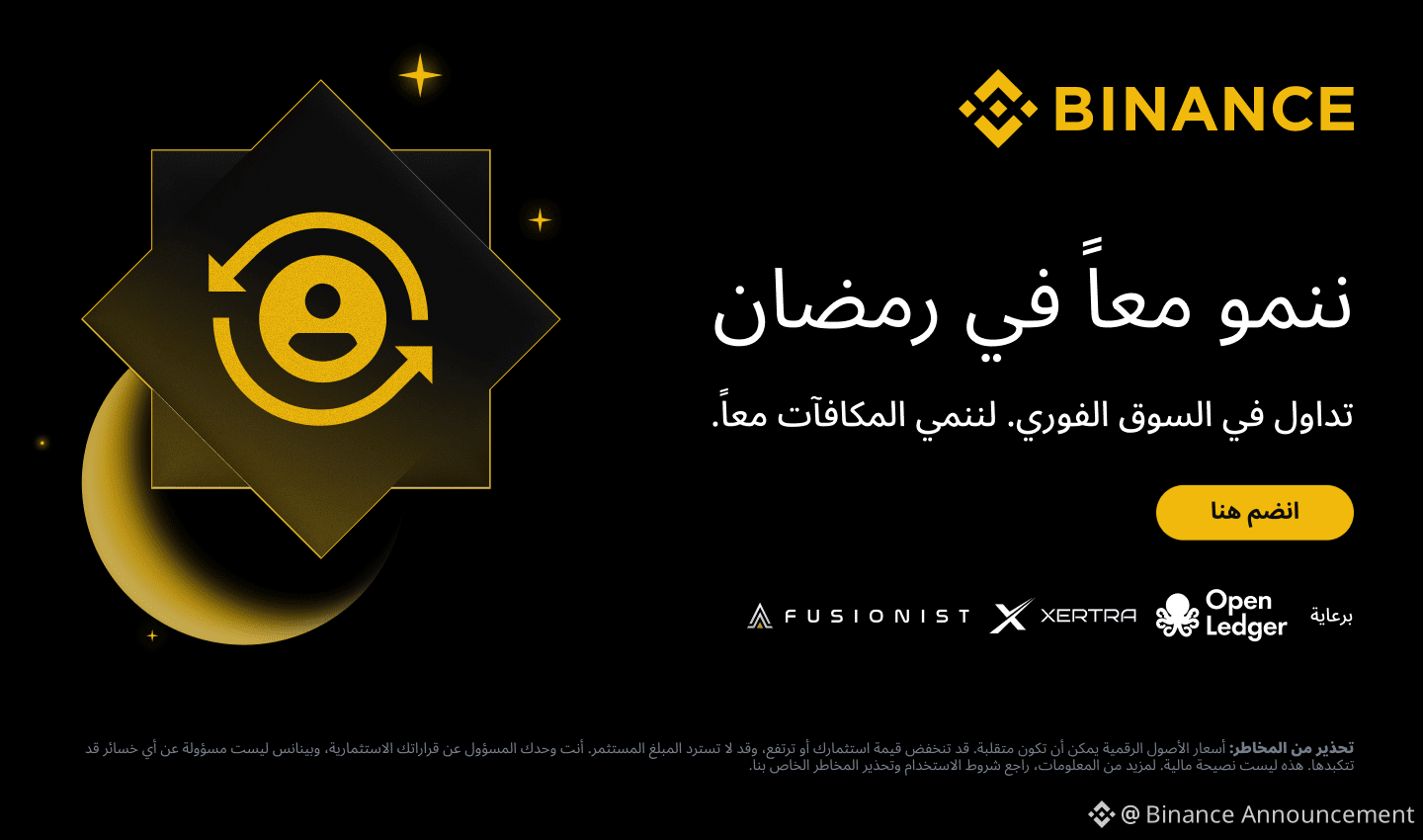 نقدّم لكم Binance رمضان انمُ معاً 2026، وهي حملة تداول فوري جماعية يعمل فيها المجتمع بأكمله معاً لفتح مجمّع مكافآت بقيمة 50,000$ يتم توزيعه بعملات OPEN وACE وSTRAX.