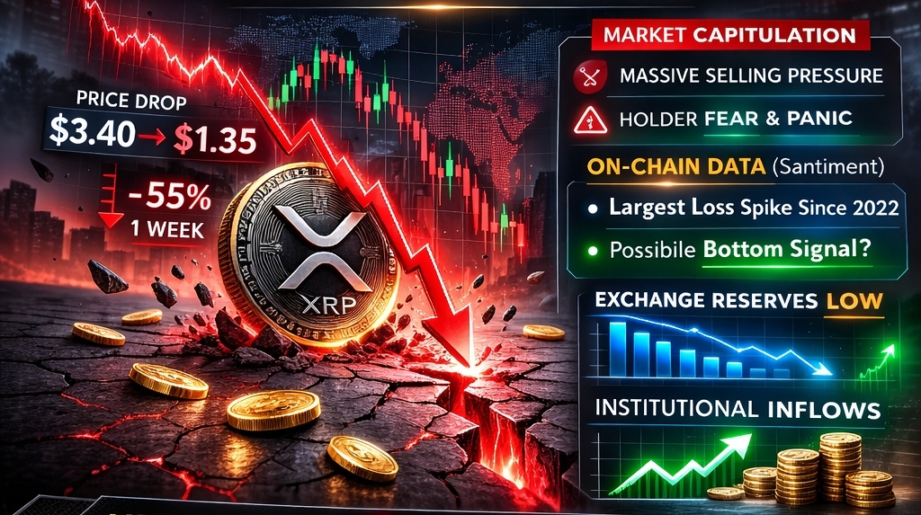 On-chain analytics (from Santiment) show that **XRP recorded roughly $1.93 billion in realized losses over a single week — the largest such spike since November 2022.