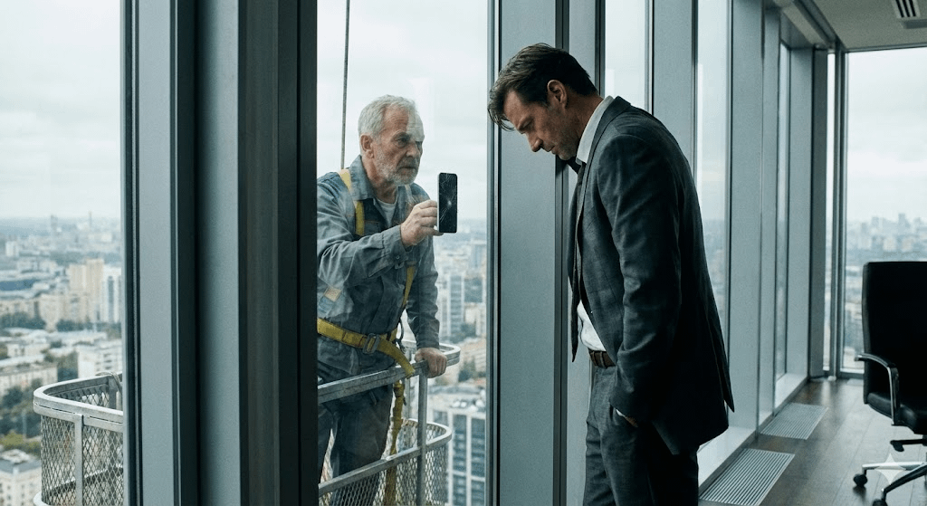 就在我准备转身走向天台通道的时候,窗外突然降下来一个吊着安全绳擦玻璃的“蜘蛛人”大叔。他隔着玻璃看出了我生无可恋的状态,竟然停下手中的活儿,从脏兮兮的工具包里掏出一个屏幕碎裂的旧手机,紧紧贴在玻璃上让我看。