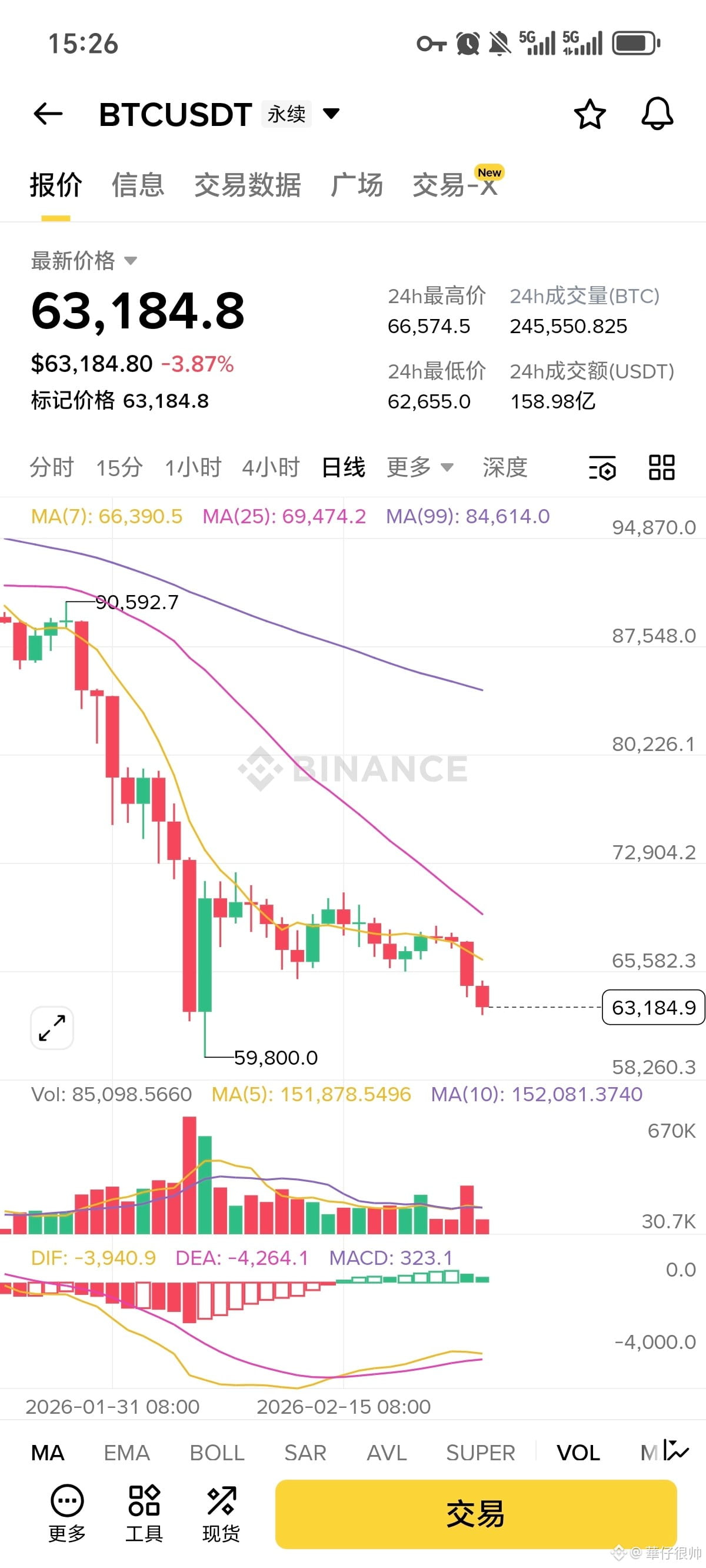 - 最新价格 / 标记价格:**63,184.8 USDT**,下跌 **-3.87%**(24小时计)