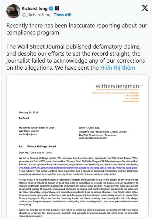 Thông qua thư do hãng luật Withers Bergman LLP đại diện, Binance yêu cầu WSJ cải chính và rút lại nội dung mà họ cho là “bôi nhọ”, đồng thời khẳng định bài viết đã bỏ qua phản hồi chính thức từ phía sàn.