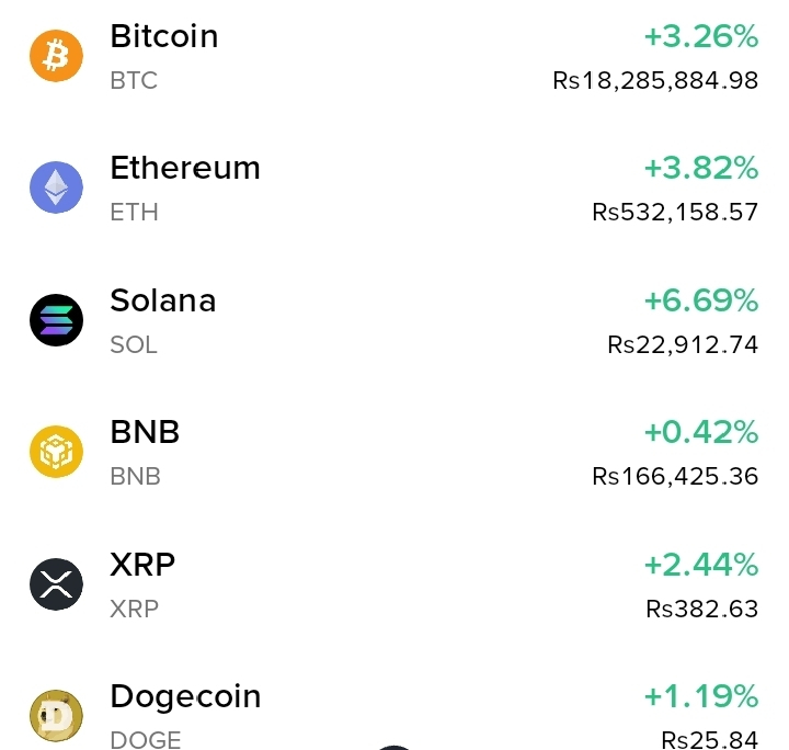 • Bitcoin (BTC) is up +3.26%, trading at Rs 18,285,884.98