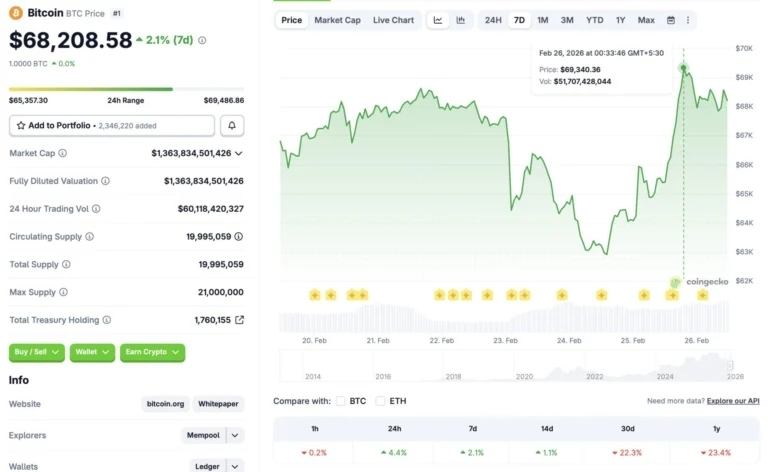 Despite the caution, analytical platform maintains a bullish short-term outlook. The firm projects Bitcoin could advance to approximately $79,706 by March 8, 2026 representing an upside of nearly 17% from current levels.