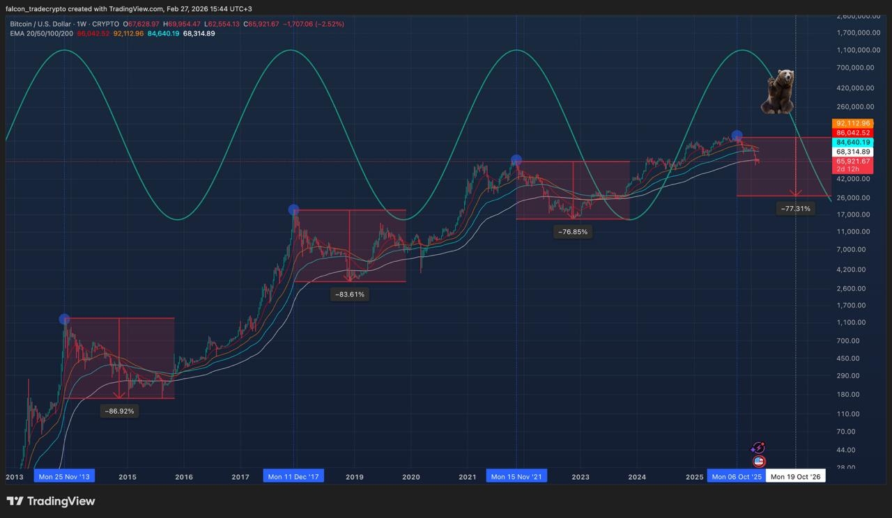 Исторически в 2015, 2018 и 2022 годах биткоин уходил значительно ниже 200-недельной EMA перед тем, как сформировать окончательное дно. Тогда рынок дополнительно терял ещё 20–30% в финальной фазе капитуляции.
