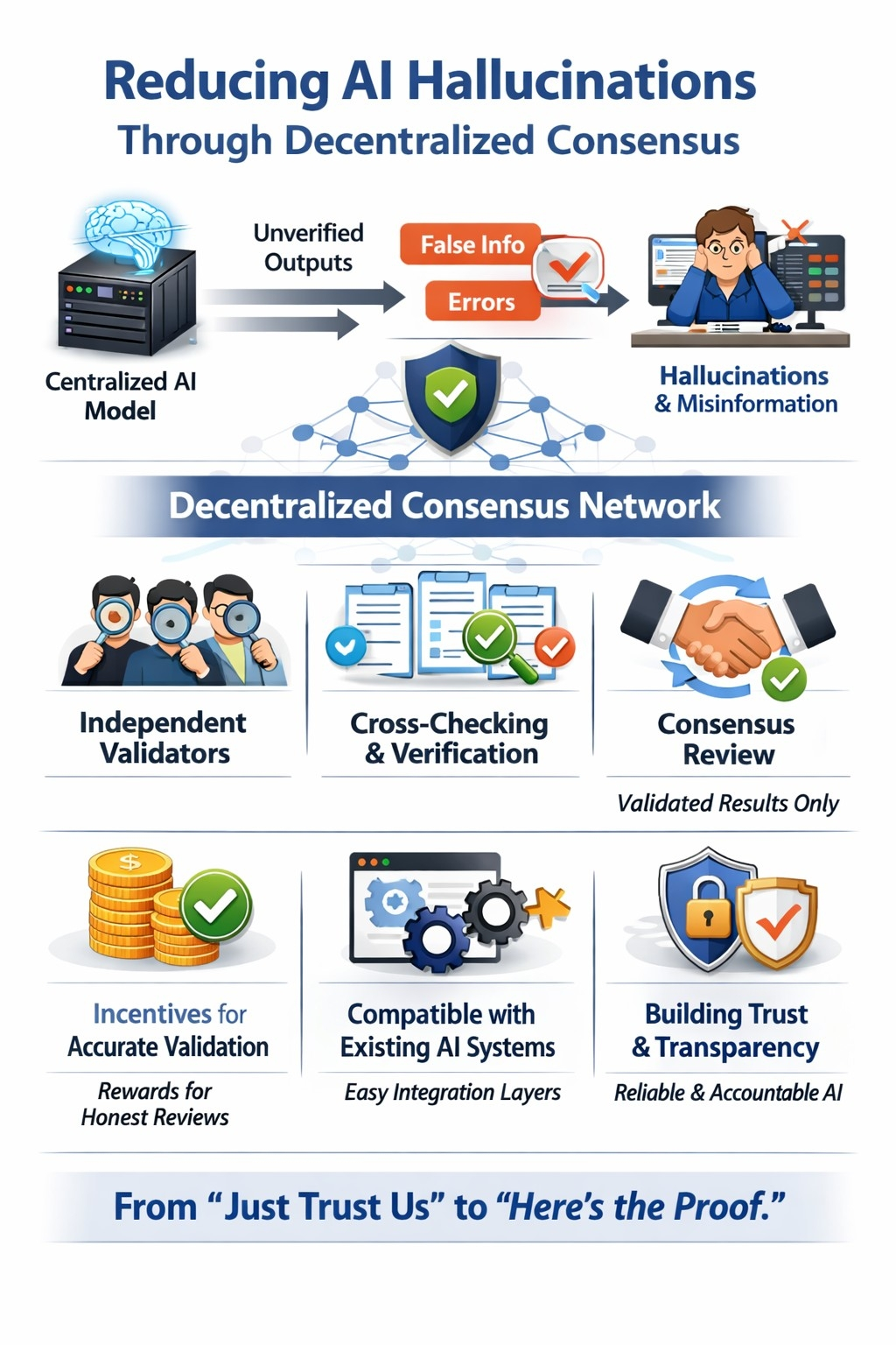 Fixing this isn’t just about feeding the model more data or making it bigger.The whole structure needs a rethink.Decentralized consensus points the way forward.Instead of letting one AI declare the answer,you bring in a network of independent validators who all look at the output.They cross examine it, compare notes,and agree or don’t on whether it holds up to scrutiny.The system only accepts answers that pass this collective review,using real standards for accuracy.