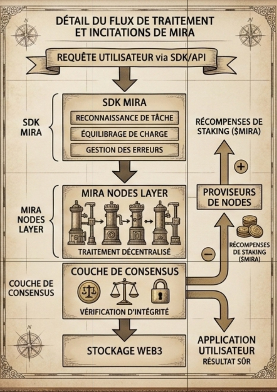 خلف الستار، توجد جيوش من العقد الموزعة التي تعالج البيانات. ما يميز ميرا هو نظام الإجماع؛ حيث يتم التحقق من صحة النتائج، ويتم مكافأة العقد النزيهة عبر نظام Staking صارم. هذا يعني أن الأمان هنا ليس خياراً، بل هو جزء من خوارزمية العمل.