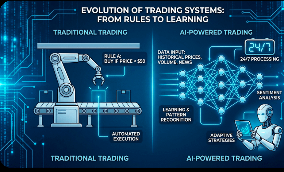 The more time I spent studying this space, the more I realized that AI trading is not some futuristic fantasy. It is already happening quietly in the background of the market. What surprised me most was how different it is from the older forms of automated trading. Traditional trading algorithms are simple in nature. Someone writes a rule and the system follows it exactly as written. If a trader programs a bot to buy when the price drops below a certain level, the bot will execute that order every single time the condition appears. It does not question the rule and it does not learn anything from past results.