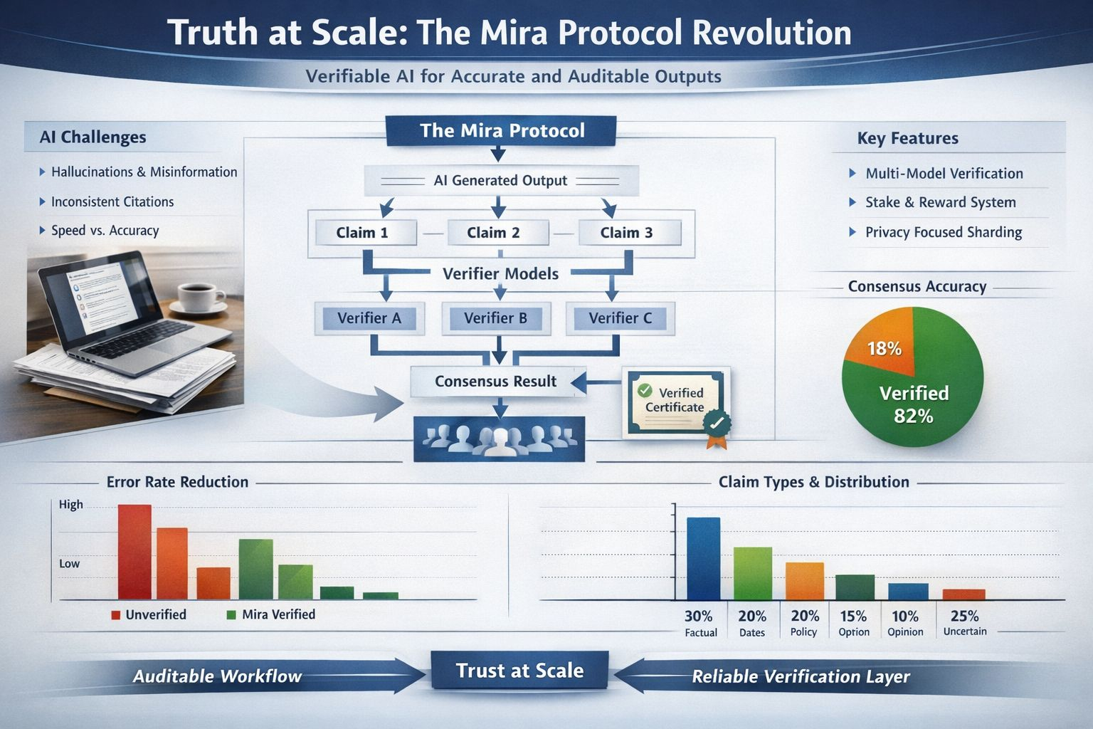 @Mira - Trust Layer of AI 7:12 a.m. Quiet conference room. Laptop teetering on printed contracts. HVAC humming like white noise. I was double-checking an AI summary before a client call, because one wrong citation doesn’t just “need a quick fix”—it can burn an hour and torch trust. And all I could think was: why are we still doing this by hand?