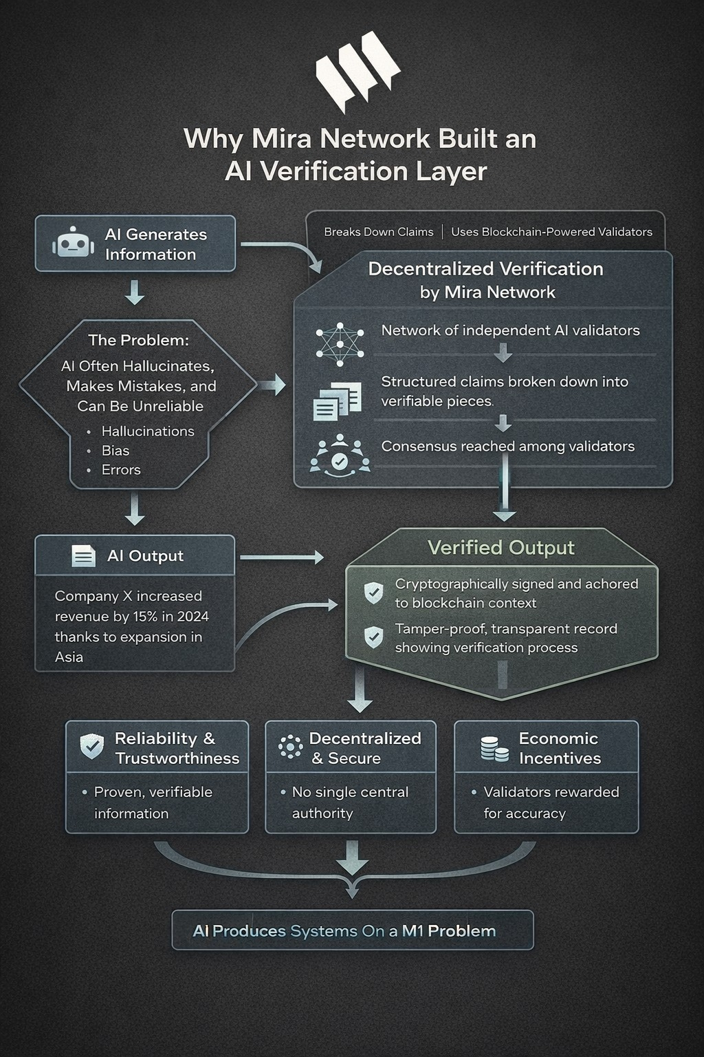 That’s where Mira Network steps in.They’ve built a decentralized verification protocol to make AI more trustworthy no single gatekeeper required.At its heart,Mira works as a blockchain powered verification layer for AI outputs.Instead of just taking an AI model’s answer as gospel,Mira breaks down big outputs into smaller,structured claims and spreads them out over a decentralized network.