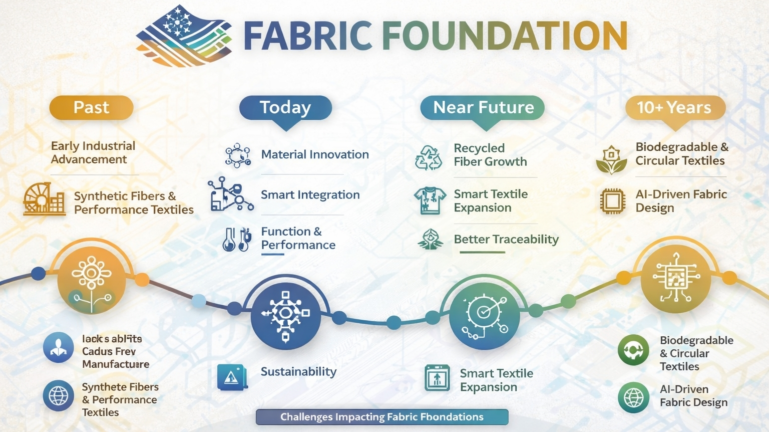 The fabric foundation is no longer simply “cloth” — it is a strategic base of materials, structure, and tech that defines performance, sustainability, and future readiness. From early industrial textiles to next‑generation smart and circular fabrics, the evolution shows a clear shift toward functionality, environmental responsibility, and integration with digital systems. The roadmap points toward a future where fabrics are intelligently designed, produced with minimal impact, and embedded with capabilities far beyond traditional uses.