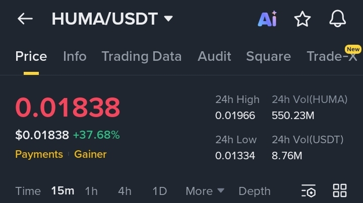 HUMA is currently in a strong short-term bullish trend. The chart shows a sequence of higher highs and higher lows, confirming bullish momentum. Price recently made a sharp impulse move from around $0.0143 → $0.0196, which indicates aggressive buying pressure and strong volume participation.