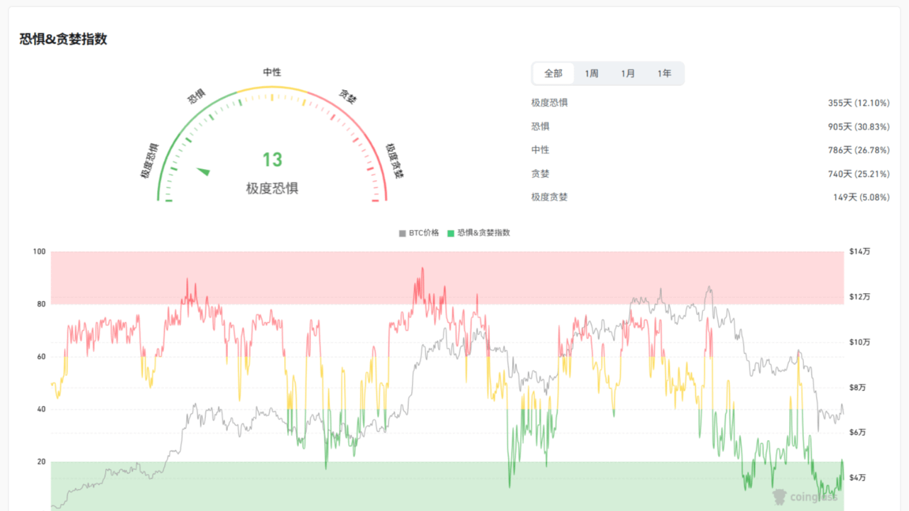 恐慌指数13(极度恐惧),ETF 3月6日BTC净流出$3.49亿(连续两日流出)、ETH $8,290万,空头拥挤迹象明显,市场重回冰点寻底。
