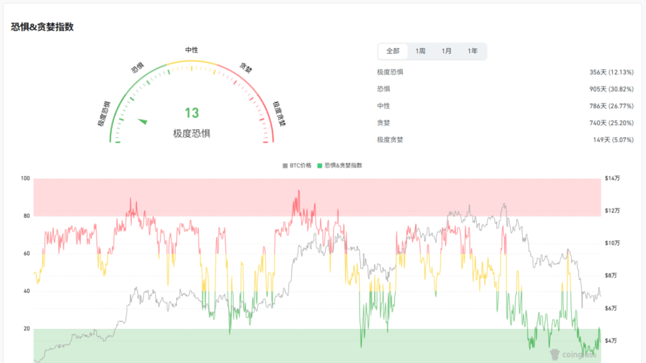 当前13(极度恐惧),较昨日持稳<20区间,连续多日徘徊极寒。价格震荡+油价飙升叠加ETF流出,散户创伤加深,价格/情绪背离预示修复启动,但需地缘缓和或CPI利好催化。