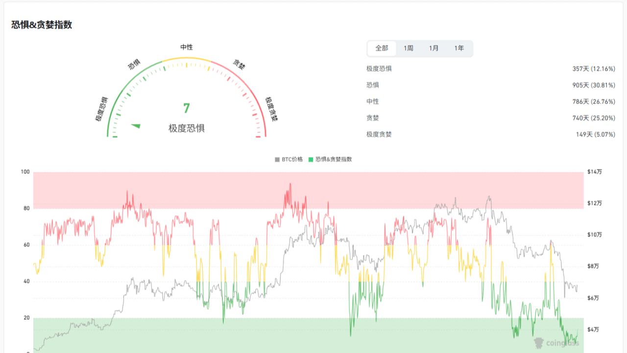 恐慌指数7(极度恐惧),全网爆仓$4.04亿,稳定币单日增4.5亿,MSTR逆势加仓17,994 BTC(持738k),静待周三CPI验证。