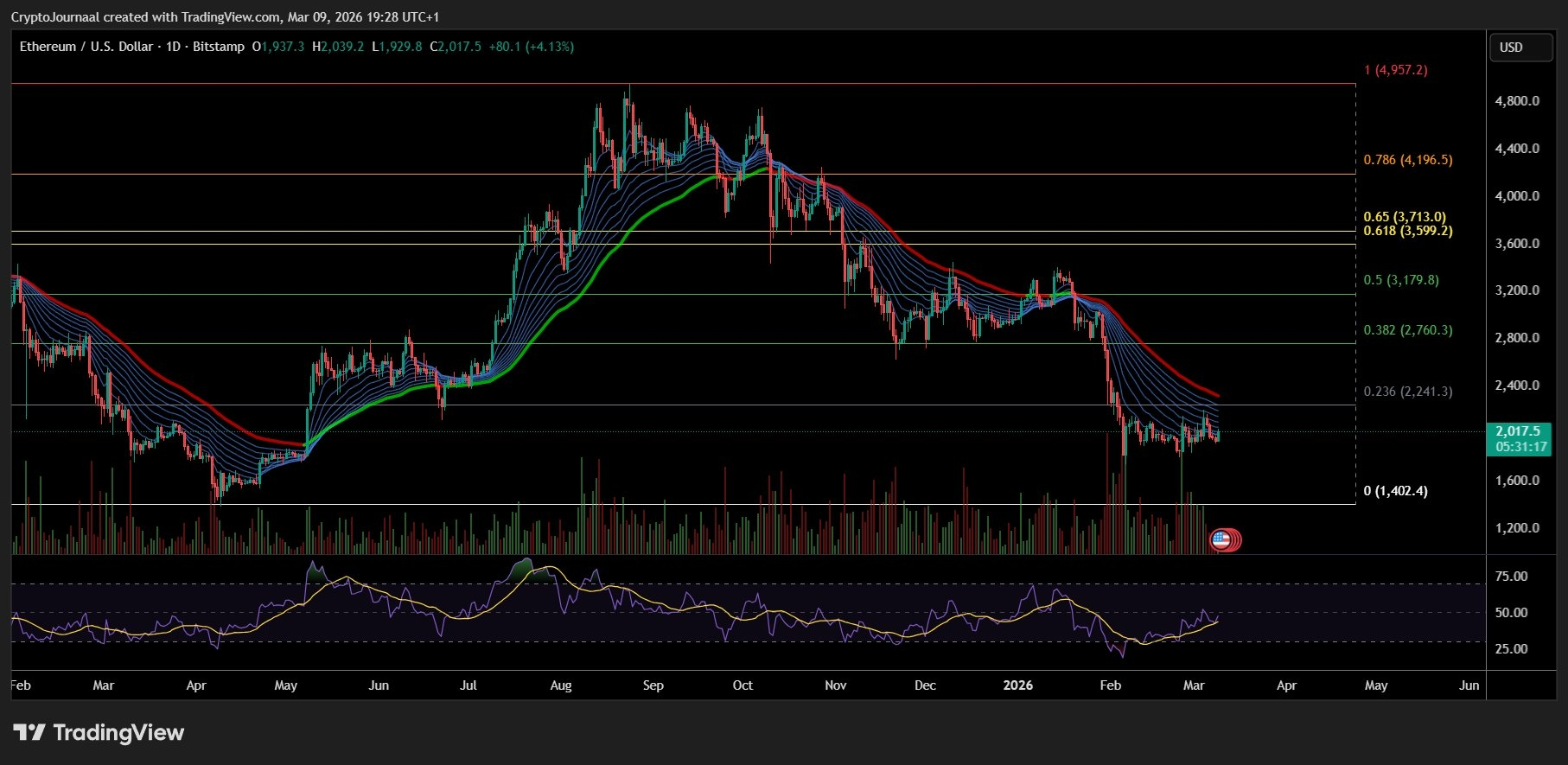 Currently, ETH is consolidating between approximately $1,900 and $2,240 (0.236 Fibonacci). This range reflects short-term market indecision as buyers attempt to defend psychological support while sellers remain active on any upward moves.